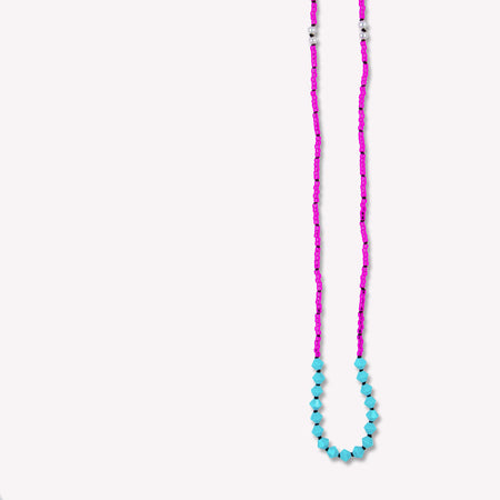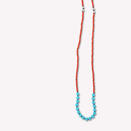 Minimalist design of white freshwater pearls, turquoise crystals and Japanese glass beads hand-knotted on a black silk cord for contrast. Sterling silver clasp.